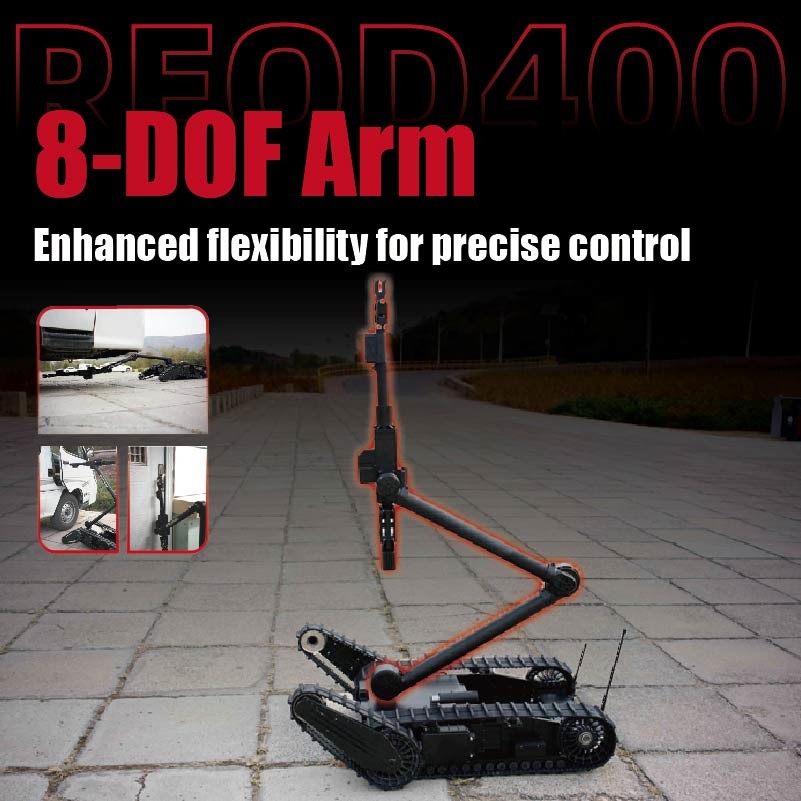 REOD400 cánh tay robot có thiết kế tích hợp 8 độ tự do, cung cấp khả năng tiếp cận không gian mạnh mẽ.Thiết kế này cho phép cánh tay robot không chỉ thực hiện các nhiệm vụ loại bỏ bom thông thường mà còn thực hiện các hoạt động mà robot loại bỏ bom thông thường không thể xử lý, chẳng hạn như nắm bắt các vật thể ở môi trường hố cao, thấp, sâu hoặc trên bàn, cũng như tiến hành trinh sát đa góc trong môi trường hố cao, thấp và sâu.